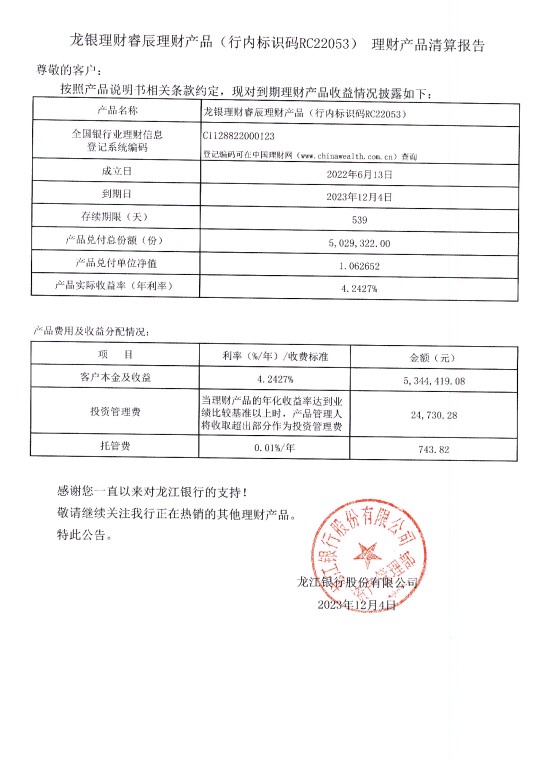 龙银理财睿辰理财产品(行内标识码RC22053)理财产品清算报告