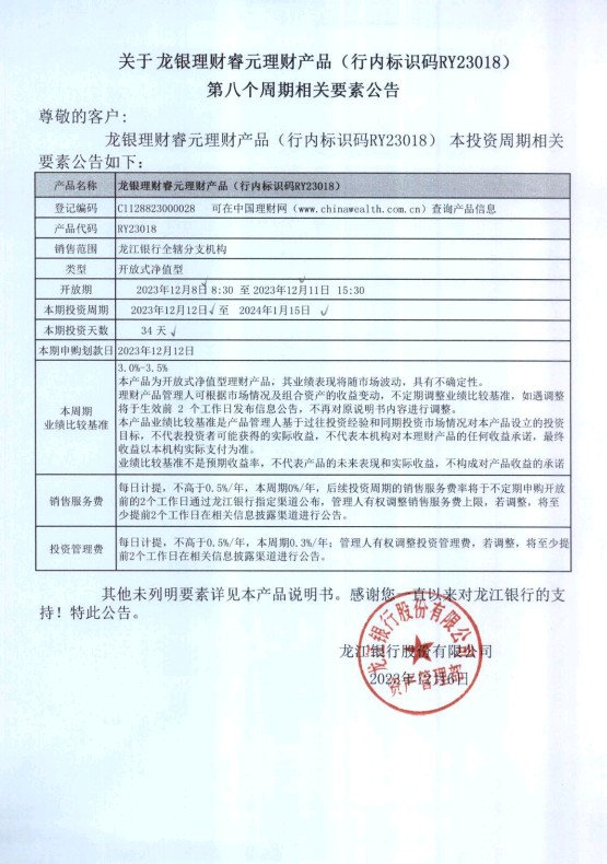 关于龙银理财睿元理财产品(行内标识码RY23018)第八个周期相关要素公告