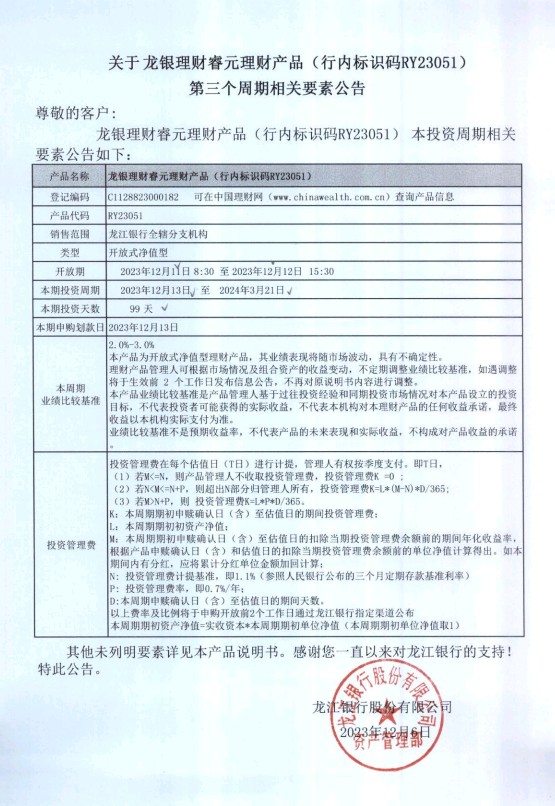 关于龙银理财睿元理财产品(行内标识码RY23051)第三个周期相关要素公告