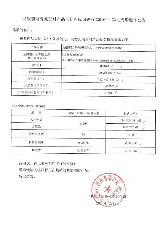 龙银理财睿元理财产品(行内标识码RY23016)第七周期运作公告