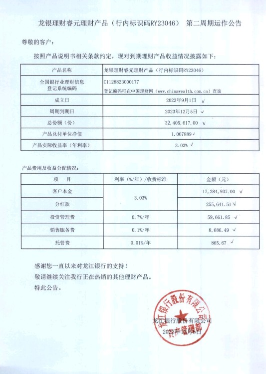 龙银理财睿元理财产品(行内标识码RY23046)第二周期运作公告