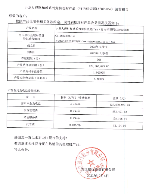 小龙人理财和盛系列龙信理财产品(行内标识码LX2022052)清算报告