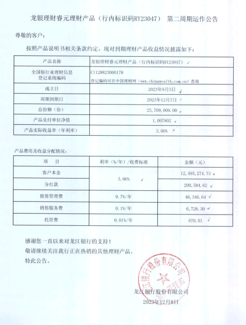 龙银理财睿元理财产品(行内标识码RY23047)第二周期运作公告