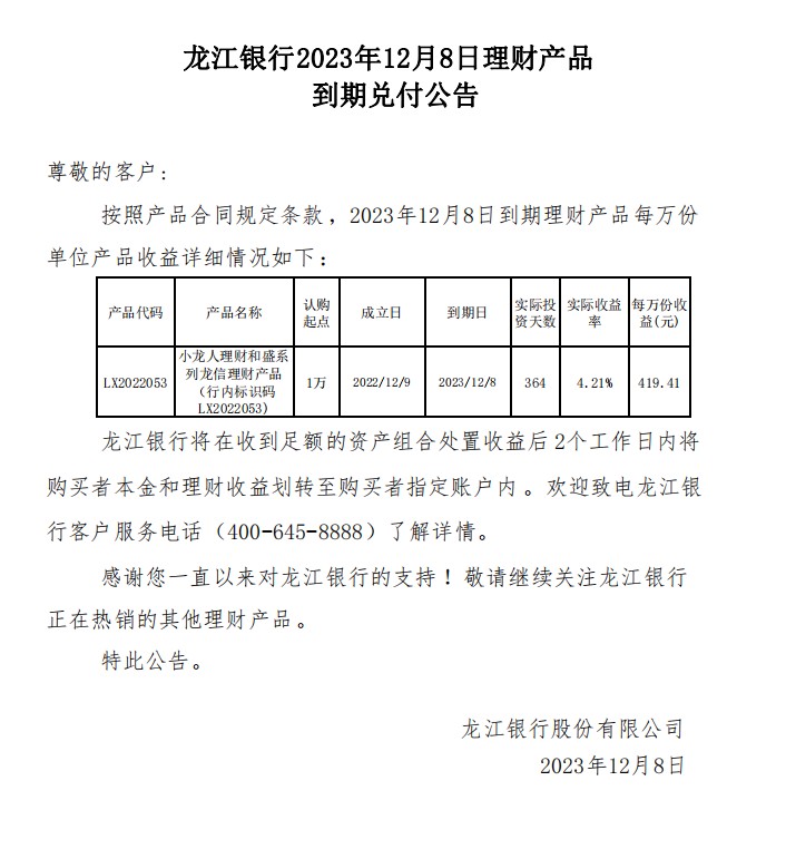 龙江银行2023年12月8日理财产品到期兑付公告