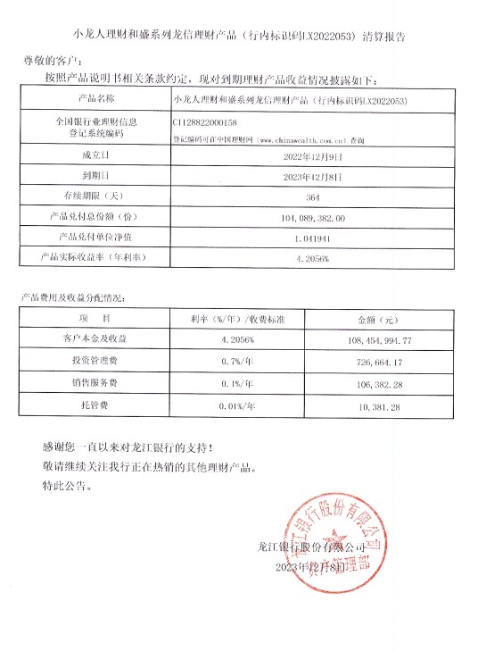 小龙人理财和盛系列龙信理财产品(行内标识码LX2022053)清算报告