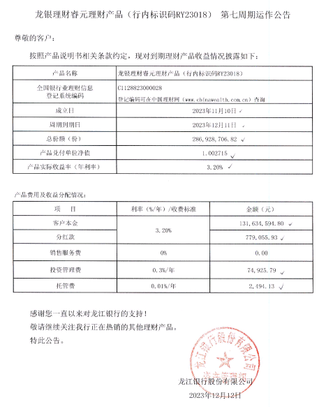 龙银理财睿元理财产品(行内标识码RY23018)第七周期运作公告