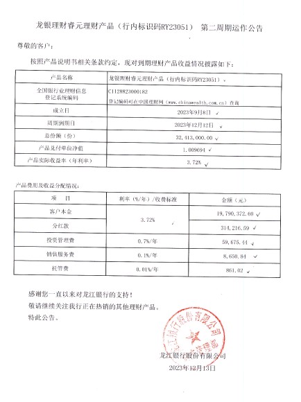 龙银理财睿元理财产品(行内标识码RY23051)第二周期运作公告