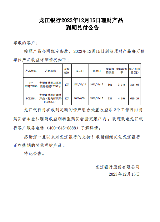 龙江银行2023年12月15日理财产品到期兑付公告