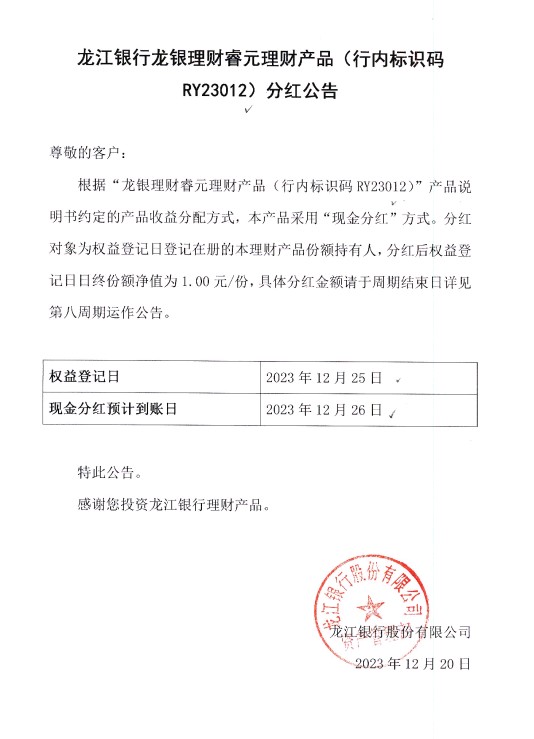 龙银理财睿元理财产品(行内标识码RY23012)分红公告