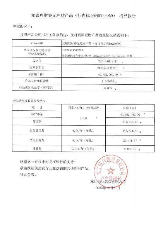 龙银理财睿元理财产品(行内标识码RY23059)清算报告