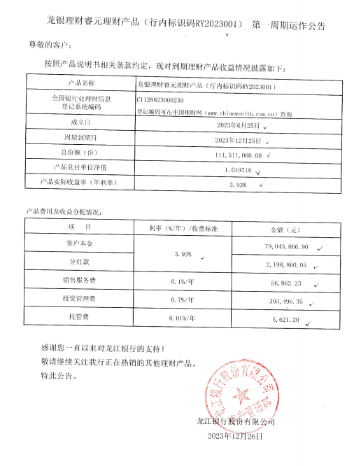 龙银理财睿元理财产品(行内标识码RY2023001)第一周期运作公告