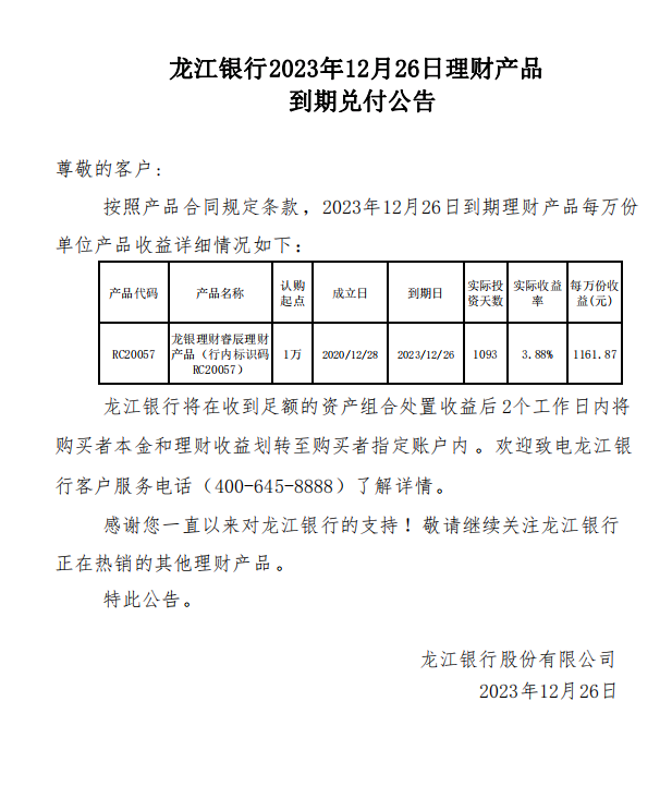 龙江银行2023年12月26日理财产品到期兑付公告