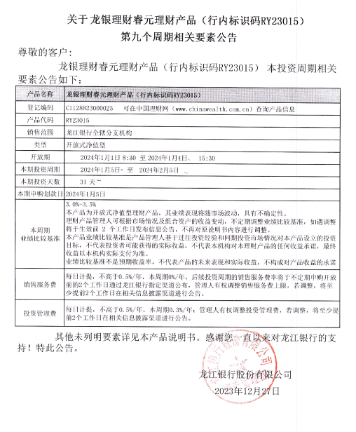 龙银理财睿元理财产品(行内标识码RY23015)第九个周期相关要素公告