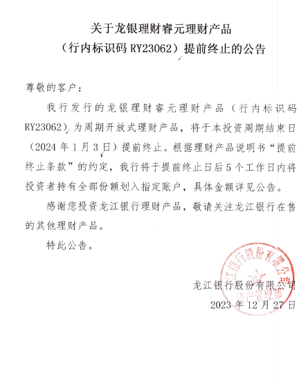 龙银理财睿元理财产品(行内标识码RY23062)提前终止的公告