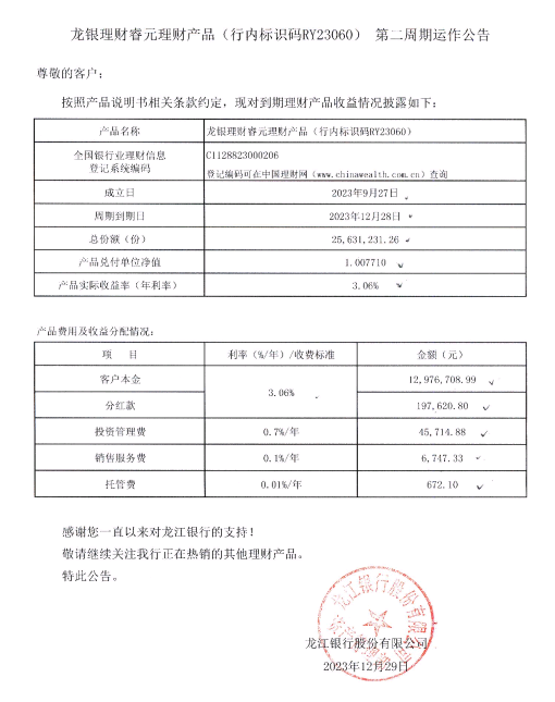 龙银理财睿元理财产品(行内标识码RY23060)第二周期运作公告