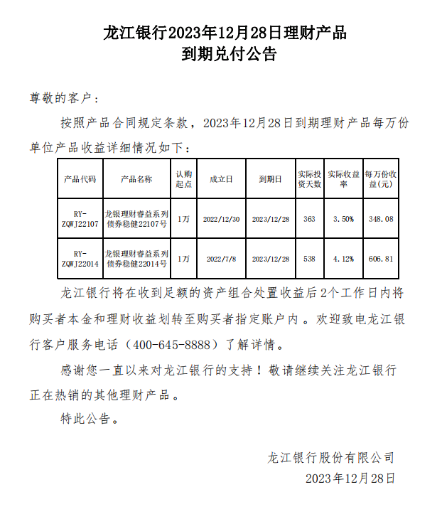 龙江银行2023年12月28日理财产品到期兑付公告