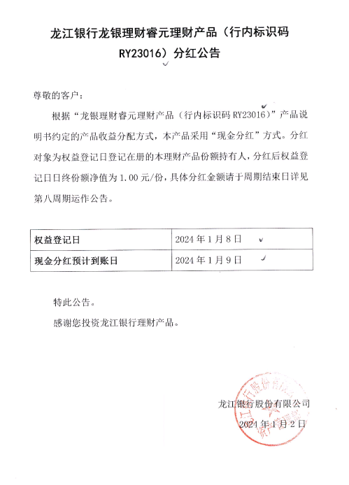 关于龙银理财睿元理财产品(行内标识码RY23016)分红公告