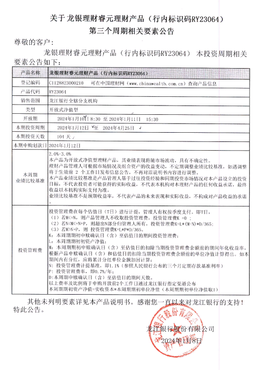 龙银理财睿元理财产品(行内标识码RY23064)第三个周期相关要素公告