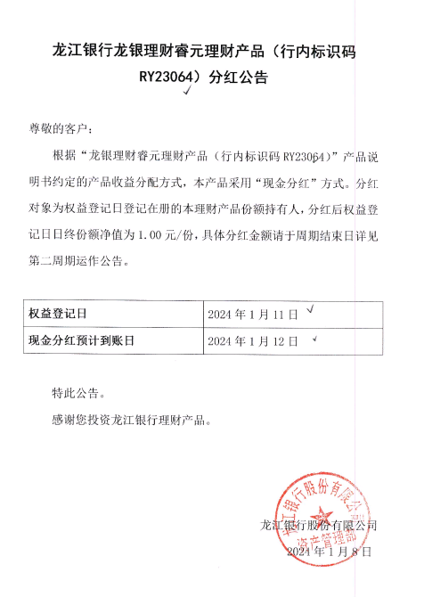 龙银理财睿元理财产品(行内标识码RY23064)分红公告