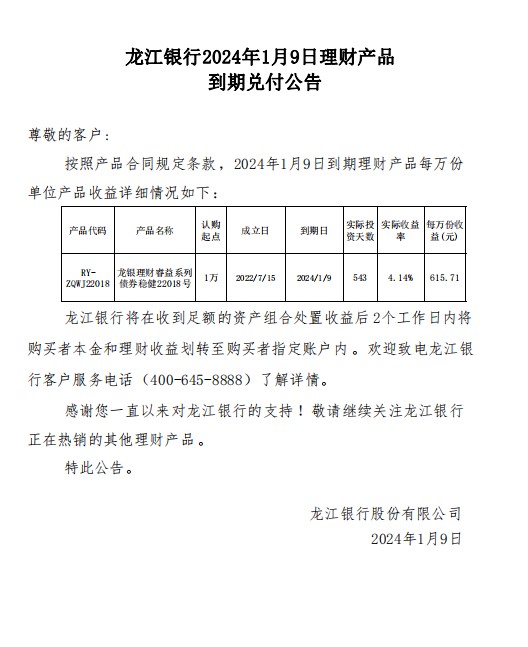 龙江银行2024年1月9日理财产品到期兑付公告