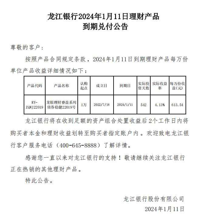 龙江银行2024年1月11日理财产品到期兑付公告