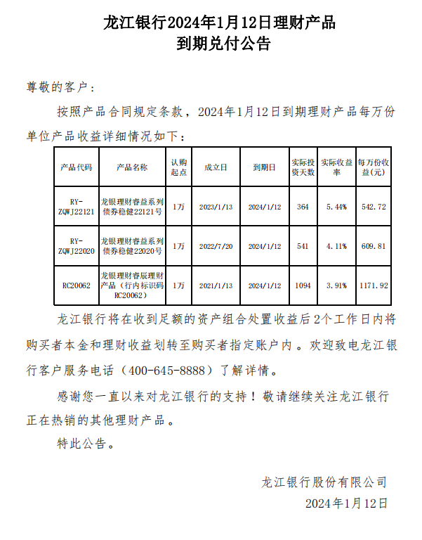龙江银行2024年1月12日理财产品到期兑付公告