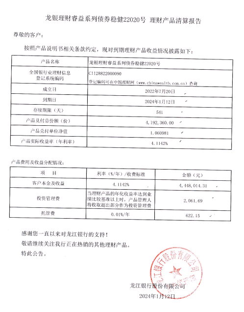 龙银理财睿益系列债券稳健22020号理财产品清算报告