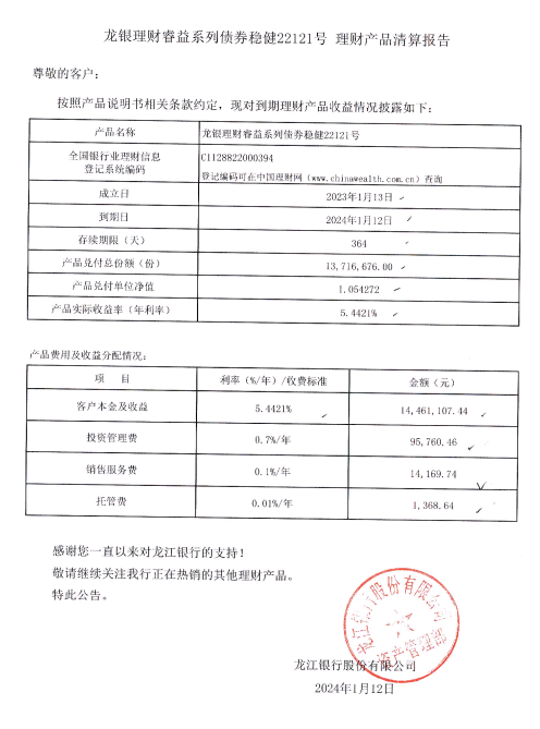 龙银理财睿益系列债券稳健22121号理财产品清算报告