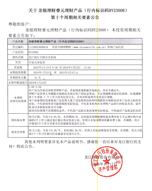 关于龙银理财睿元理财产品(行内标识码RY23008)第十个周期相关要素公告