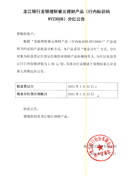 关于龙银理财睿元理财产品(行内标识码RY23008)分红公告
