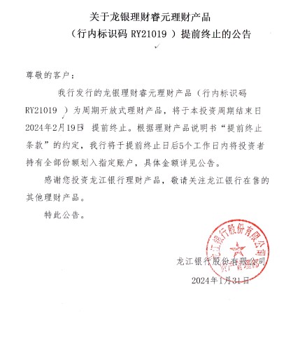 关于龙银理财睿元理财产品(行内标识码RY21019)提前终止的公告