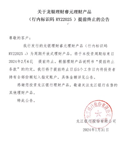 关于龙银理财睿元理财产品(行内标识码RY22025)提前终止的公告