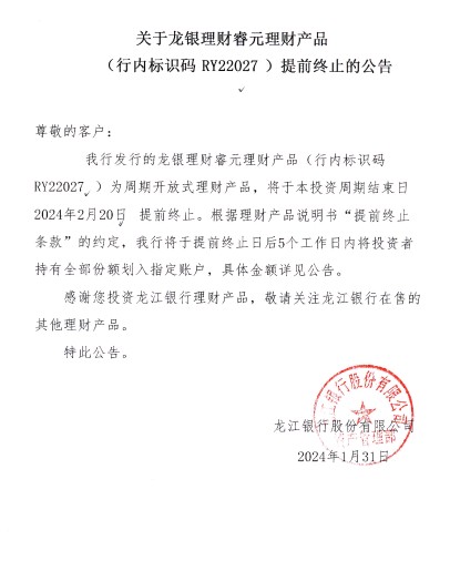 关于龙银理财睿元理财产品(行内标识码RY22027)提前终止的公告