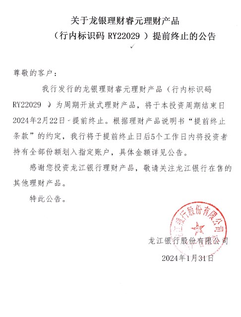 关于龙银理财睿元理财产品(行内标识码RY22029)提前终止的公告