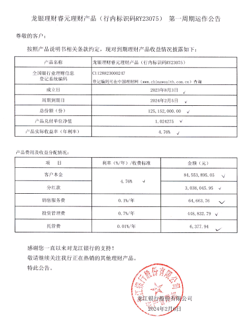 龙银理财睿元理财产品(行内标识码RY23075)第一周期运作公告