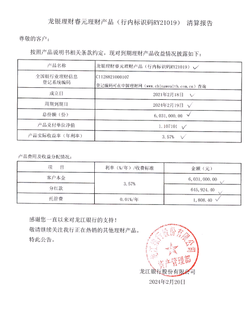 龙银理财睿元理财产品(行内标识码RY21019)清算报告