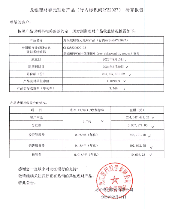 龙银理财睿元理财产品(行内标识码RY22027)清算报告