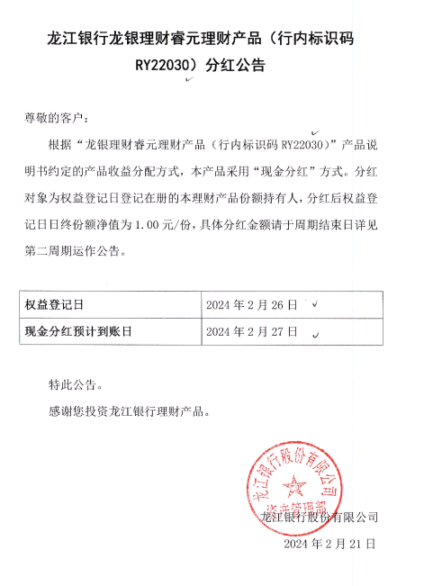 关于龙银理财睿元理财产品(行内标识码RY22030)分红公告