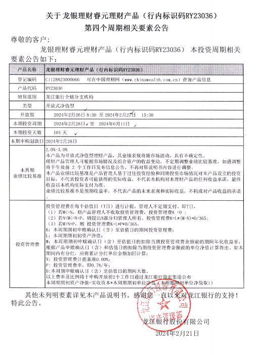 关于龙银理财睿元理财产品(行内标识码RY23036)第四个周期相关要素公告