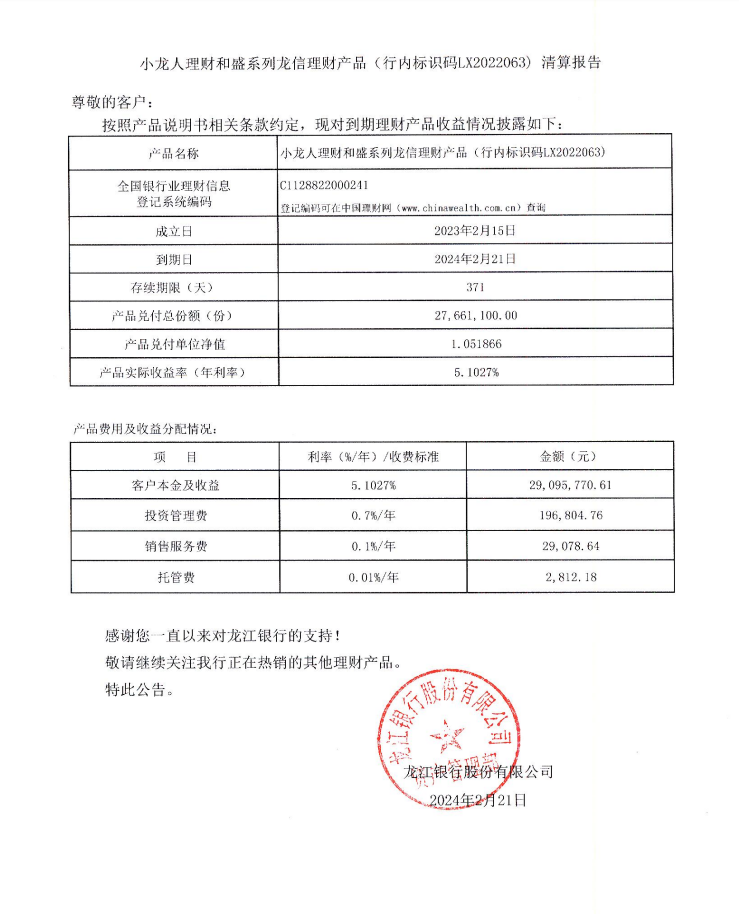 小龙人理财和盛系列龙信理财产品(行内标识码LX2022063)清算报告