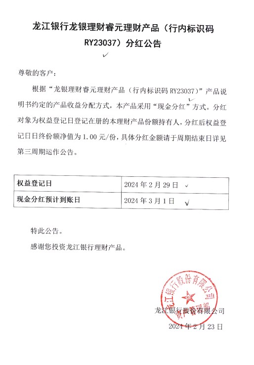 龙银理财睿元理财产品(行内标识码RY23037)分红公告