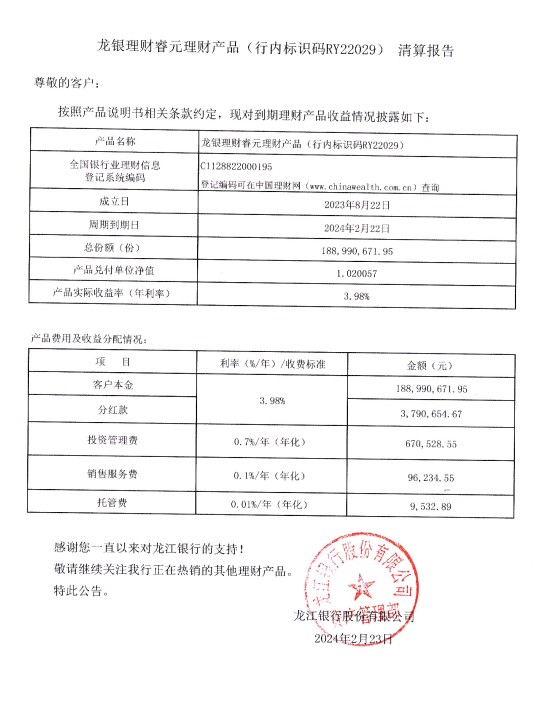 龙银理财睿元理财产品(行内标识码RY22029)清算报告