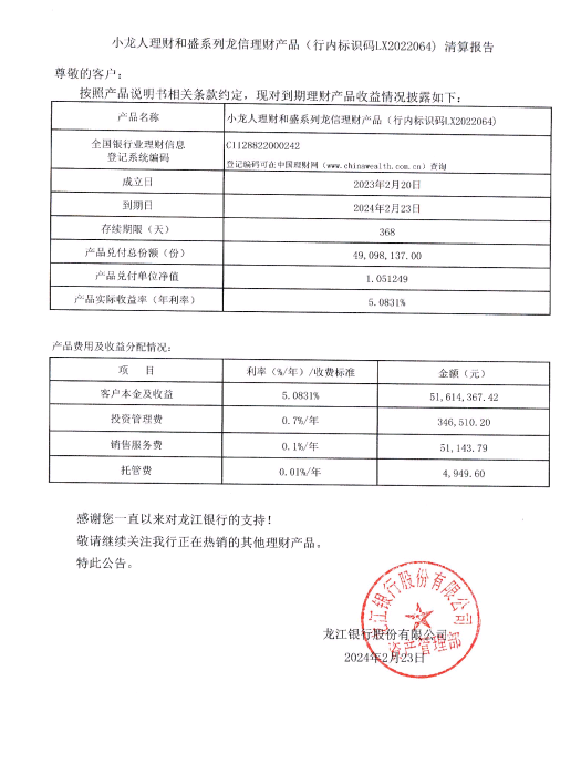 20240223小龙人理财和盛系列龙信理财产品(行内标识码LX2022064)清算报告