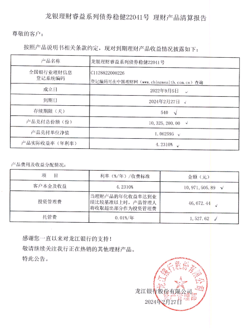 龙银理财睿益系列债券稳健22041号理财产品清算报告