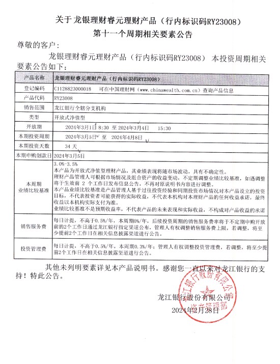 龙银理财睿元理财产品(行内标识码RY23008)第十一个周期相关要素公告