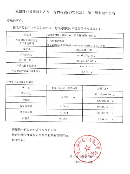 龙银理财睿元理财产品(行内标识码RY23036)第三周期运作公告