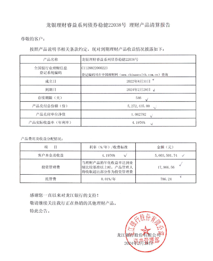 龙银理财睿益系列债券稳健22038号理财产品清算报告