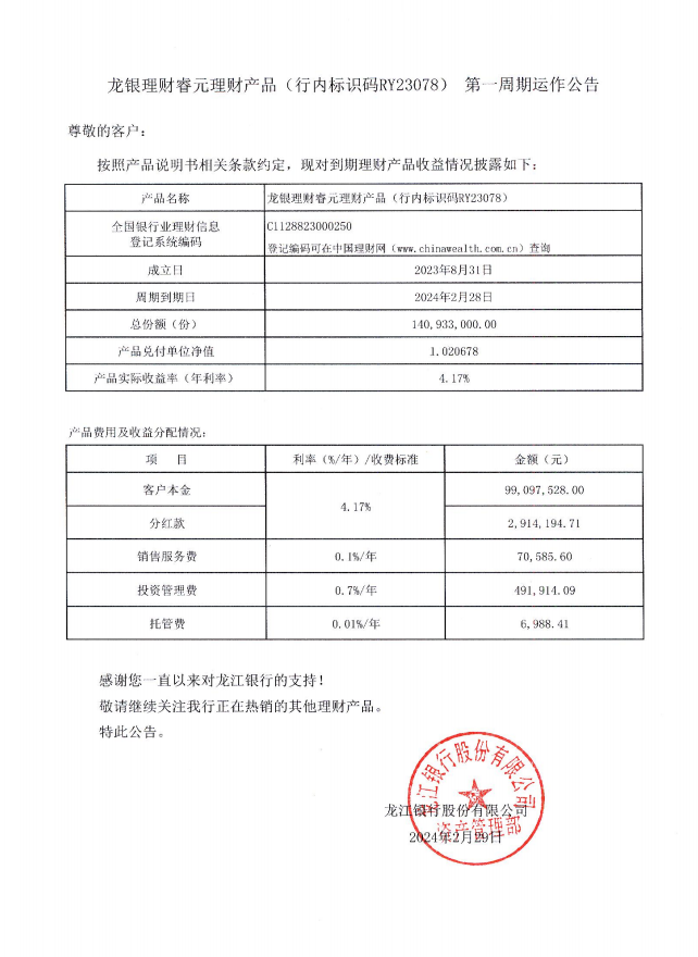龙银理财睿元理财产品(行内标识码RY23078)第一周期运作公告