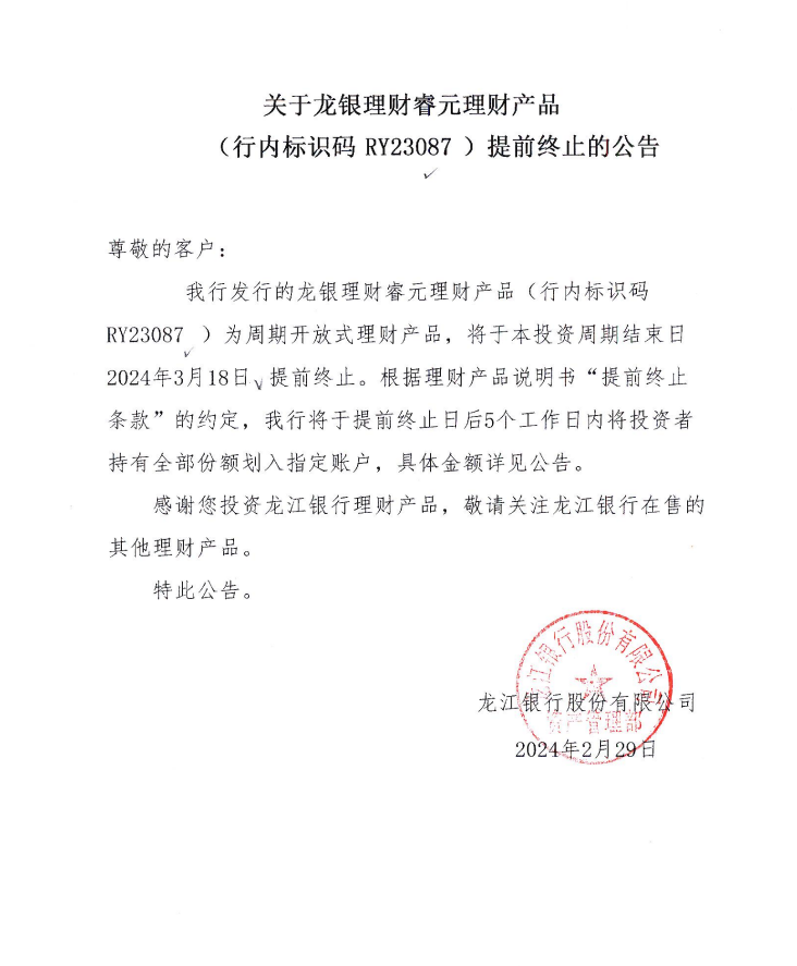 龙银理财睿元理财产品(行内标识码RY23087)提前终止的公告