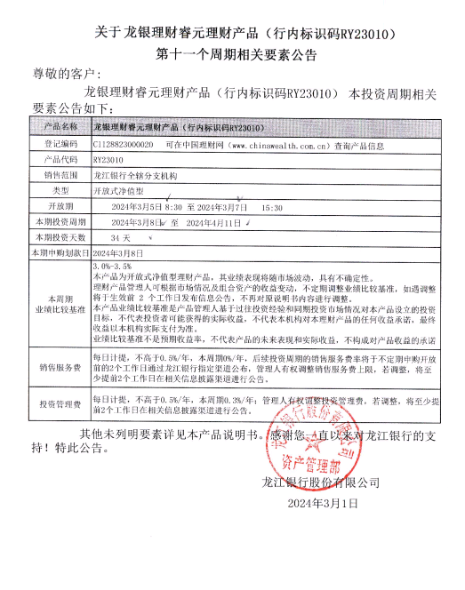 关于龙银理财睿元理财产品(行内标识码RY23010)第十一个周期相关要素公告